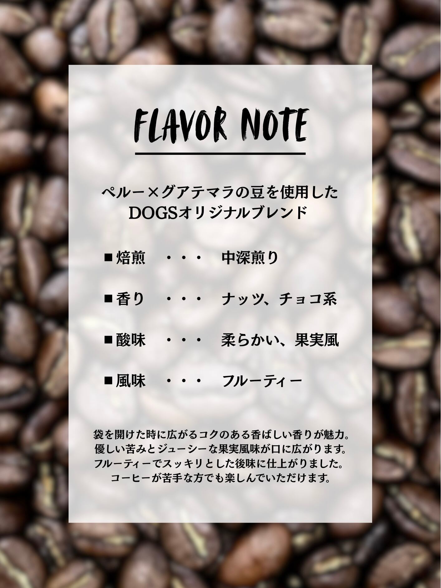 ペルーとグアテマラの豆を使用したDOGSオリジナルブレンドの